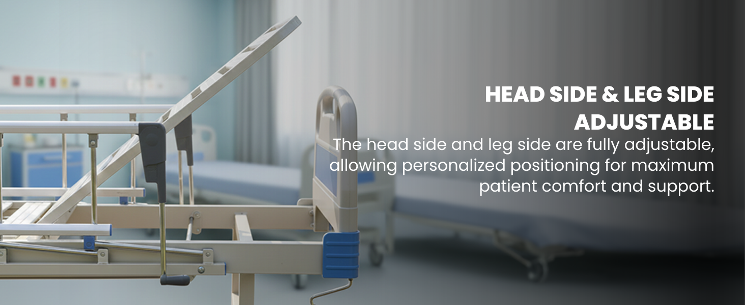 2-function manual hospital bed with side railings, saline rod, and mattress. Features head-up adjustment up to 80°, Leg side adjustable heavy-duty castors with pedal brakes, and manual levers for safe, reliable patient care.