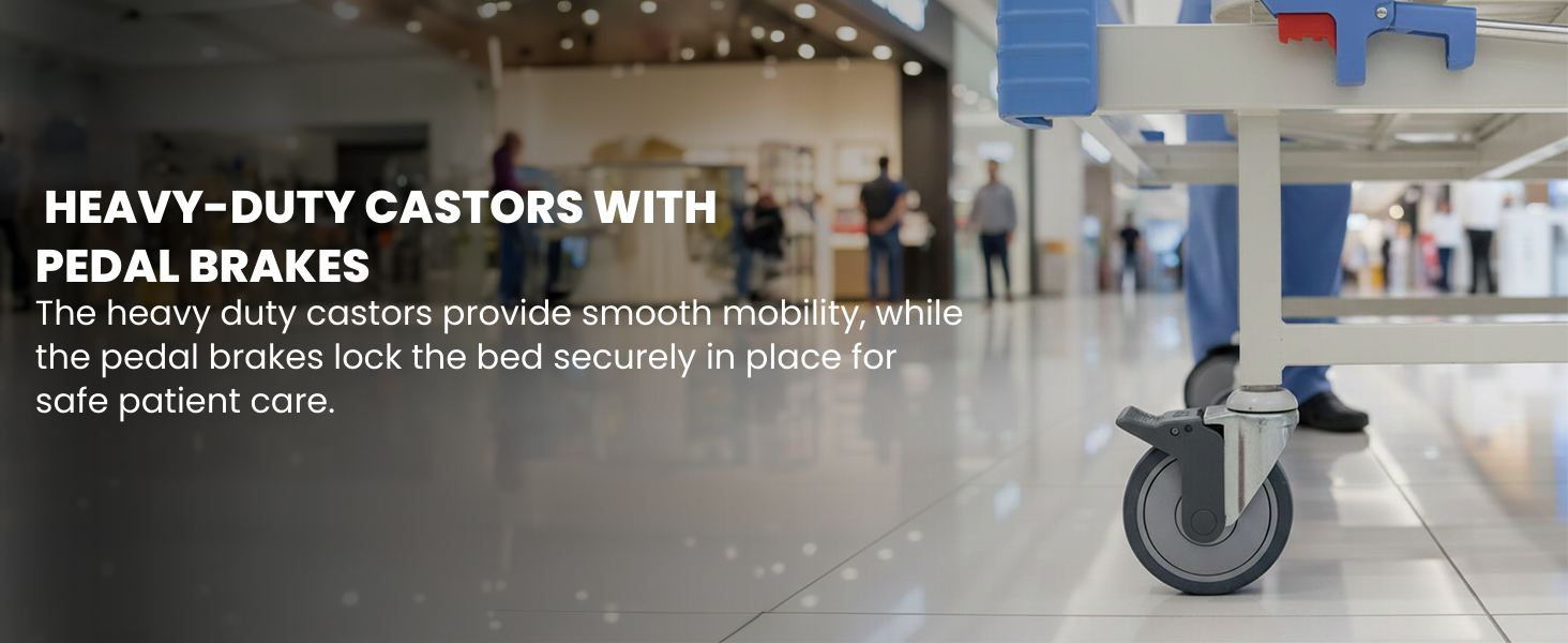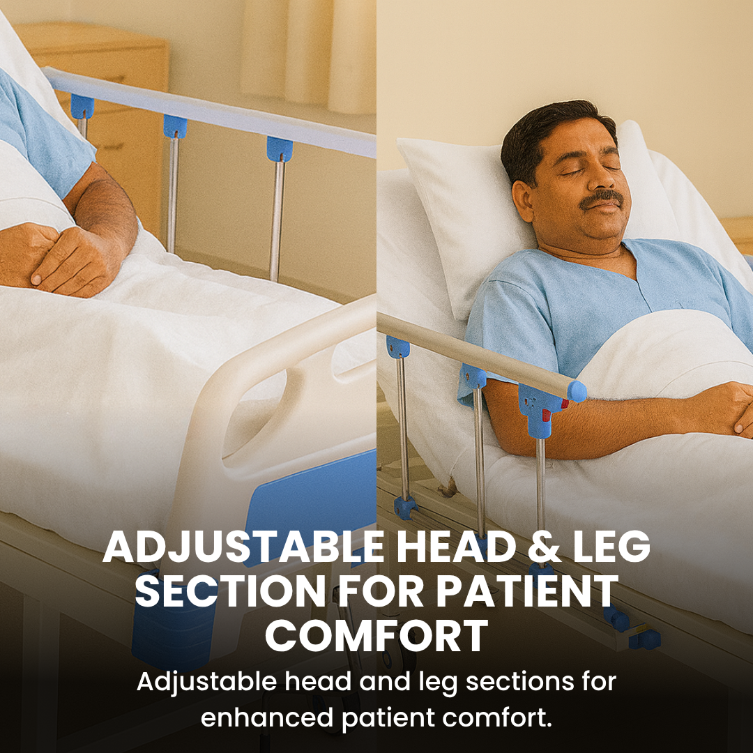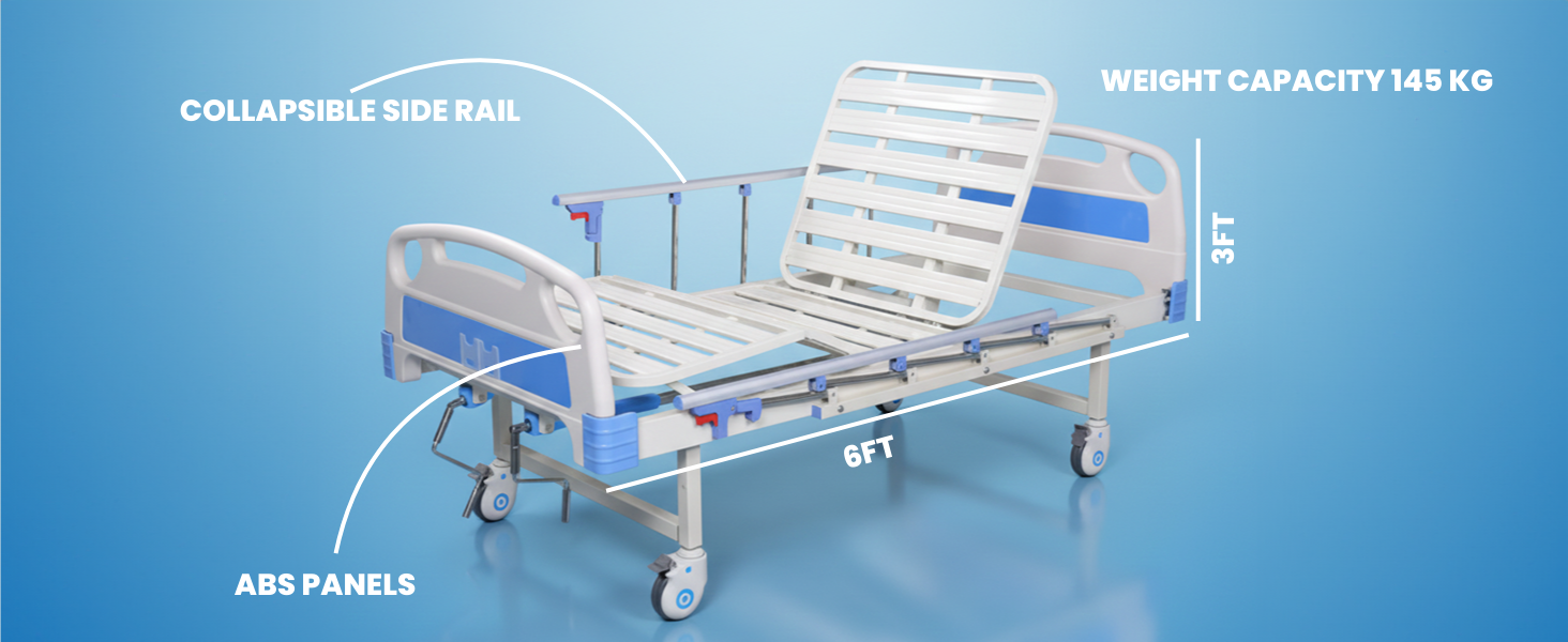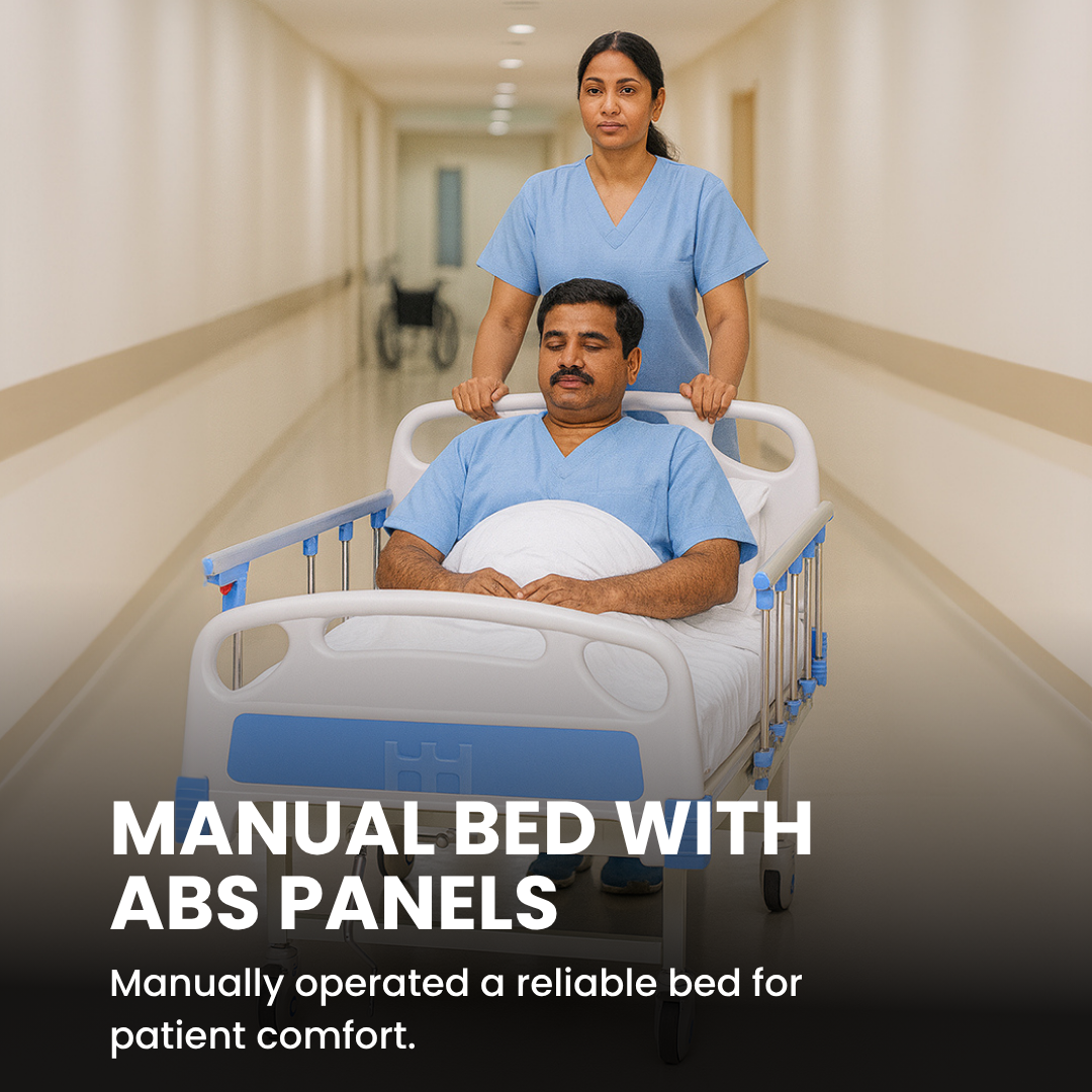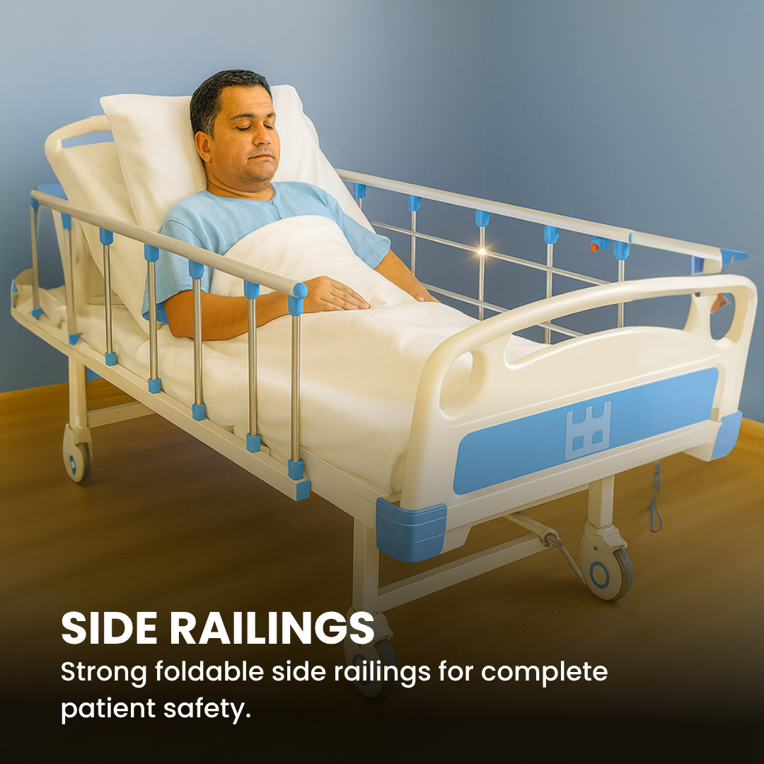 2-function manual hospital bed with side railings, saline rod, and mattress. Features head-up adjustment up to 80°, Leg side adjustable heavy-duty castors with pedal brakes, and manual levers for safe, reliable patient care.