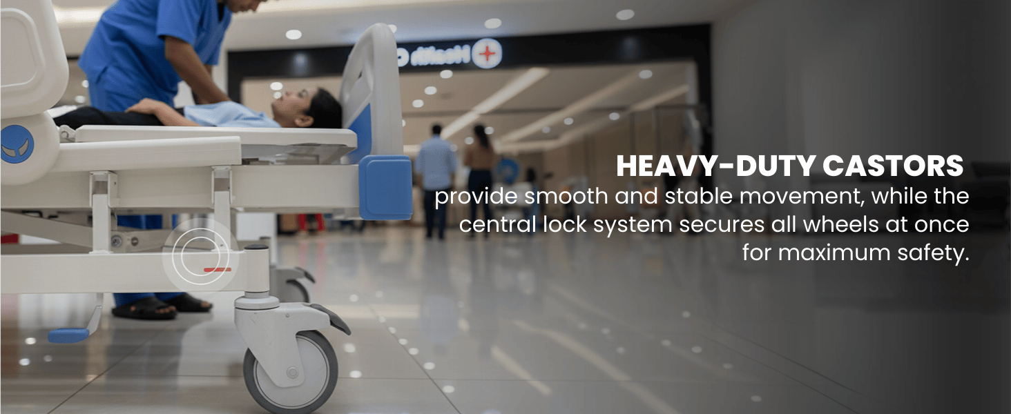 5-function electric hospital bed with advanced motor system, ABS side railings, remote control, tilting, central lock, stable support, and 120 kg capacity.