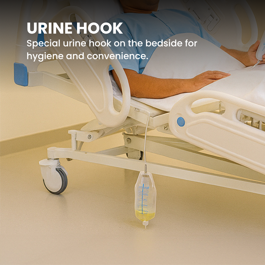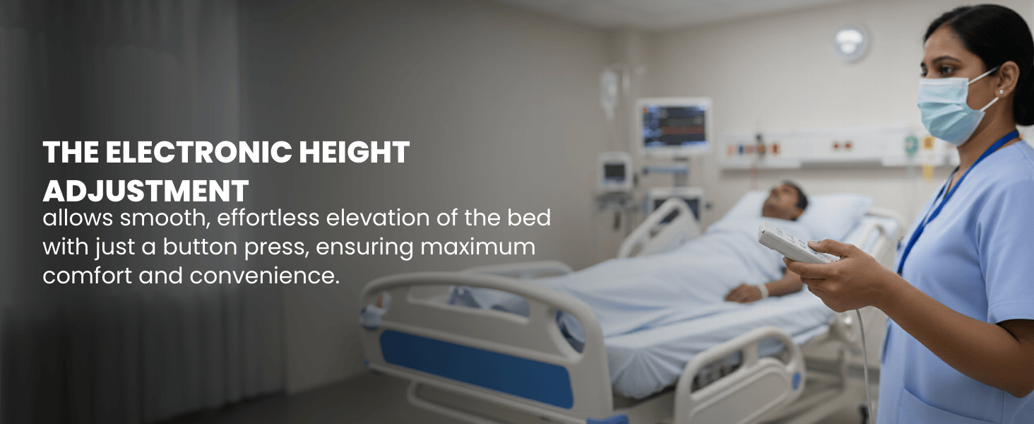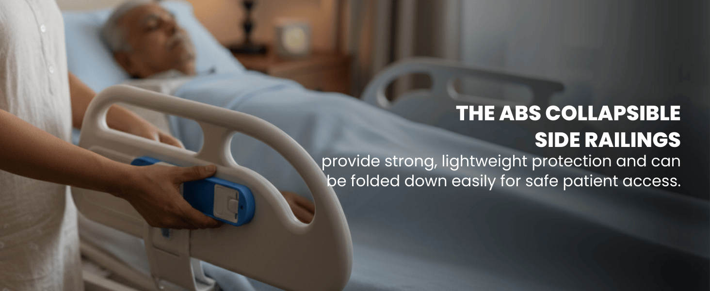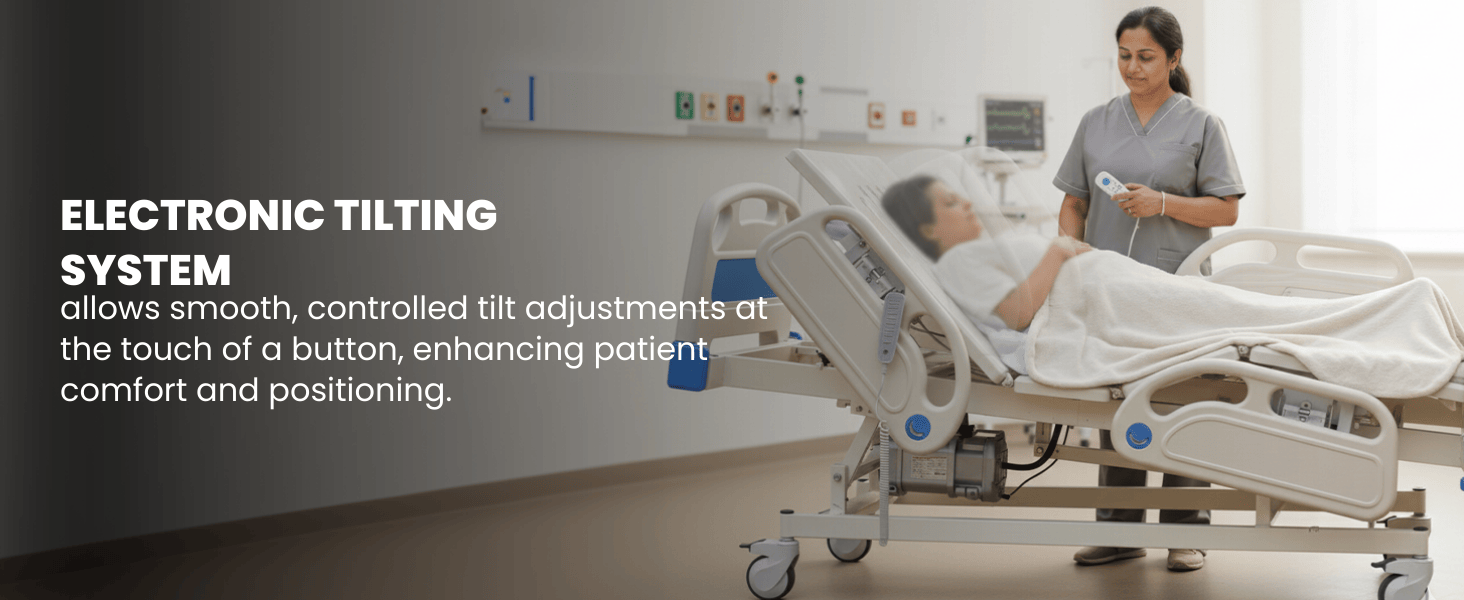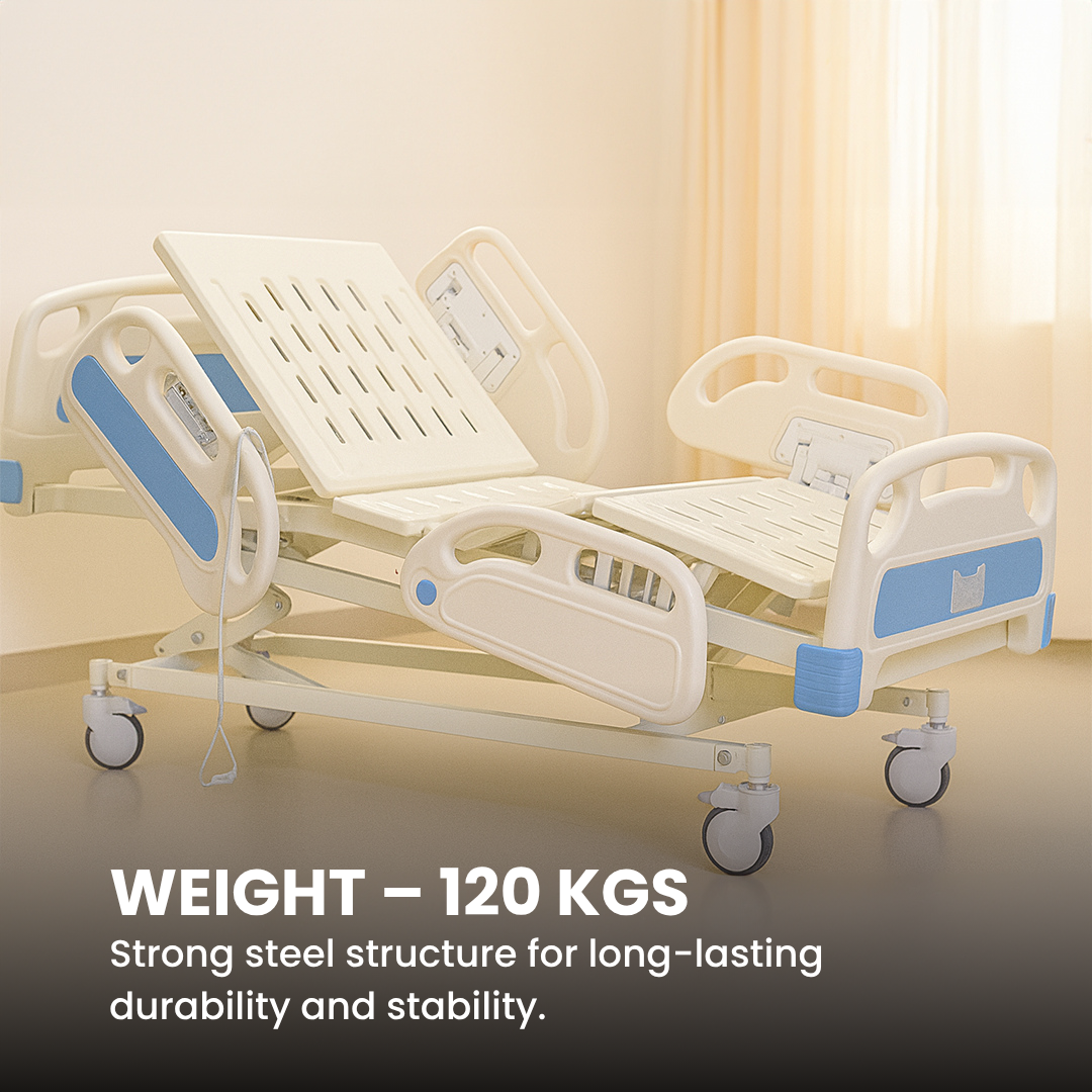 5-function electric hospital bed with advanced motor system, ABS side railings, remote control, tilting, central lock, stable support, and 120 kg capacity.