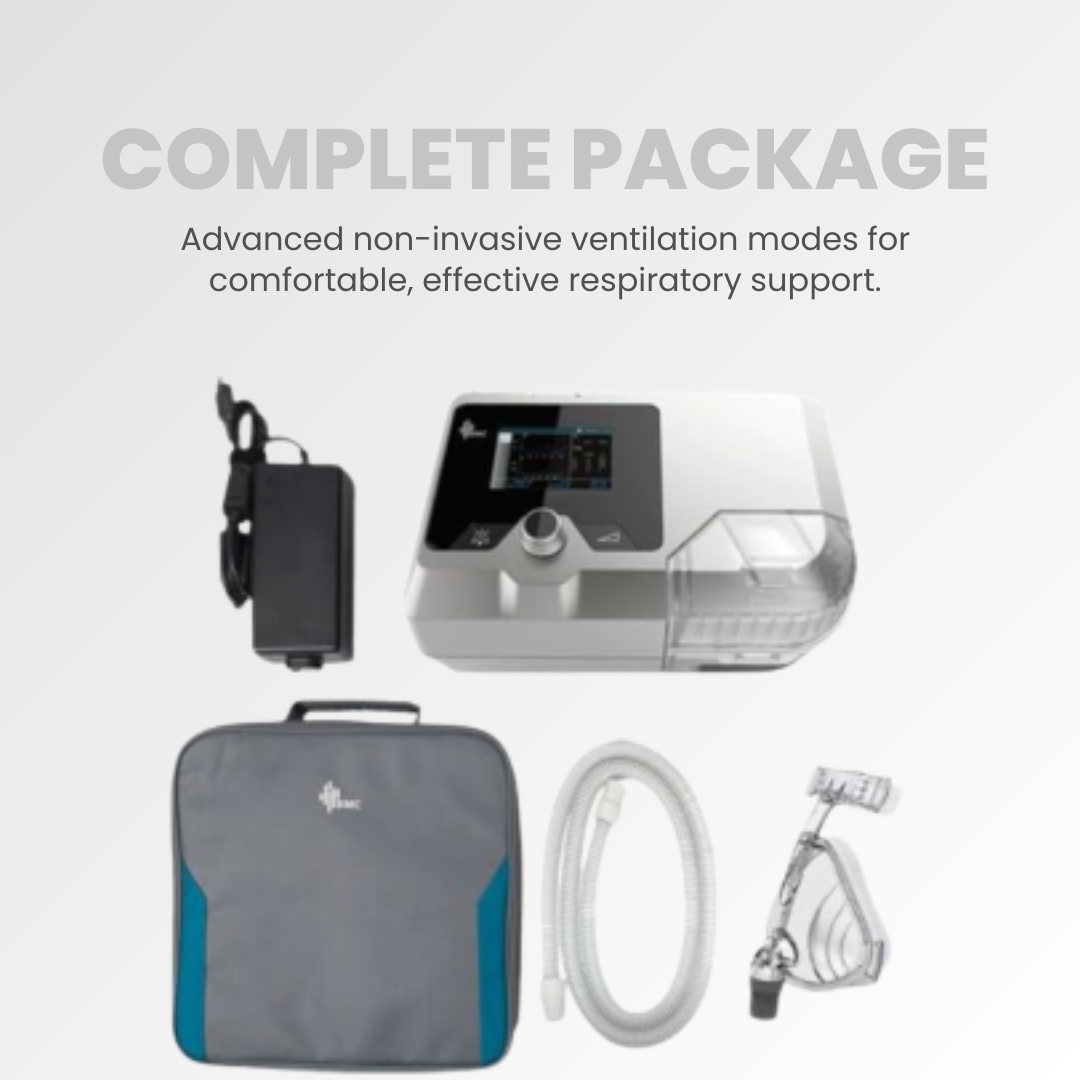 The G2S B30VT BiPAP provides non-invasive ventilation for OSA and respiratory insufficiency with CPAP, S, T, and S/T modes across a 4–30 cm H₂O pressure range. It comes complete with a full set of accessories—including mask, tubing, humidifier, and bag—and features an integrated humidifier plus targeted tidal volume delivery for enhanced comfort and effective respiratory support.