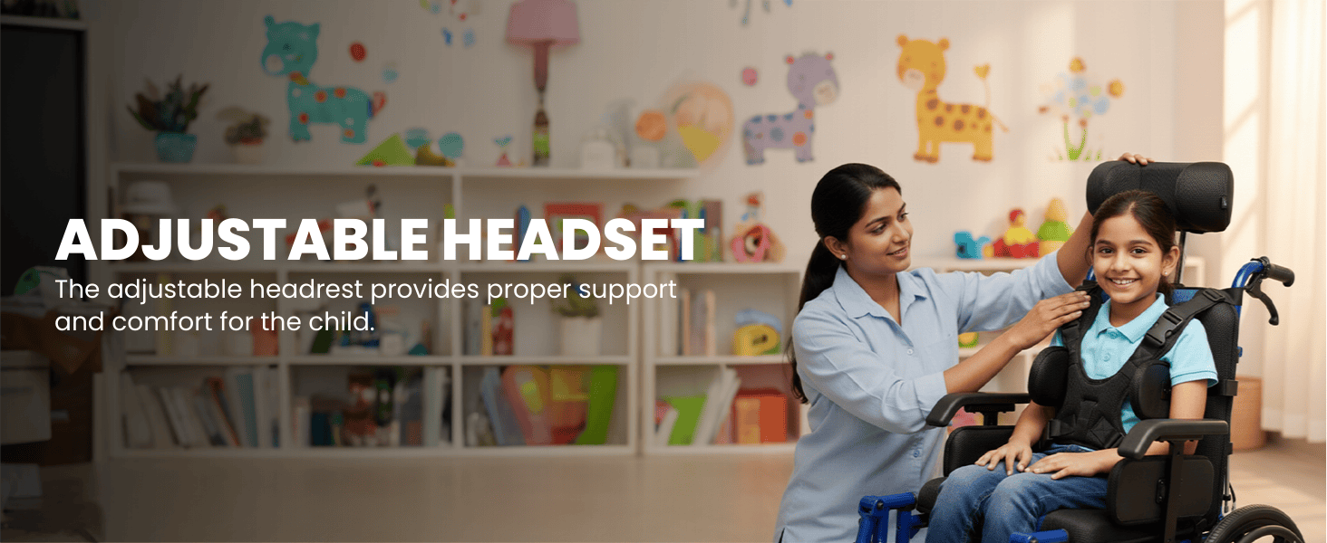 Pediatric wheelchair with adjustable headrest, detachable armrest, elevating footrest, and PU Mag rear wheels offering comfort, support, and mobility for young patients.