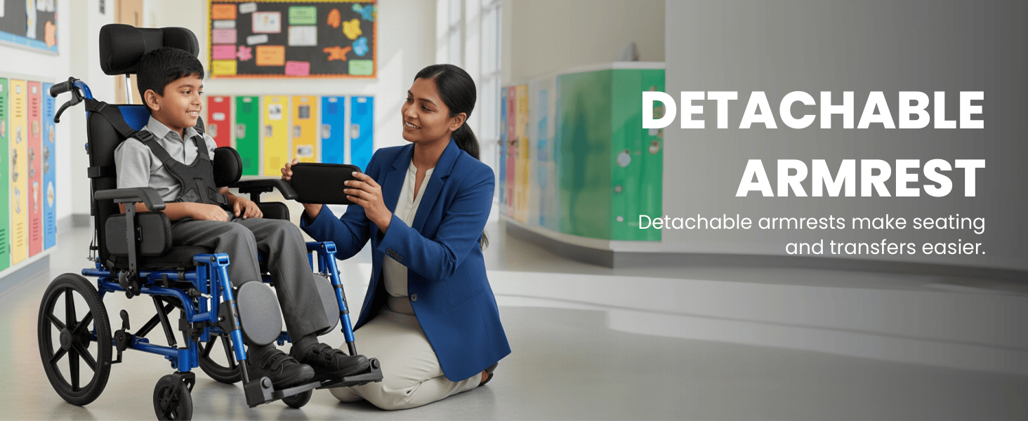 Pediatric wheelchair with adjustable headrest, detachable armrest, elevating footrest, and PU Mag rear wheels offering comfort, support, and mobility for young patients.