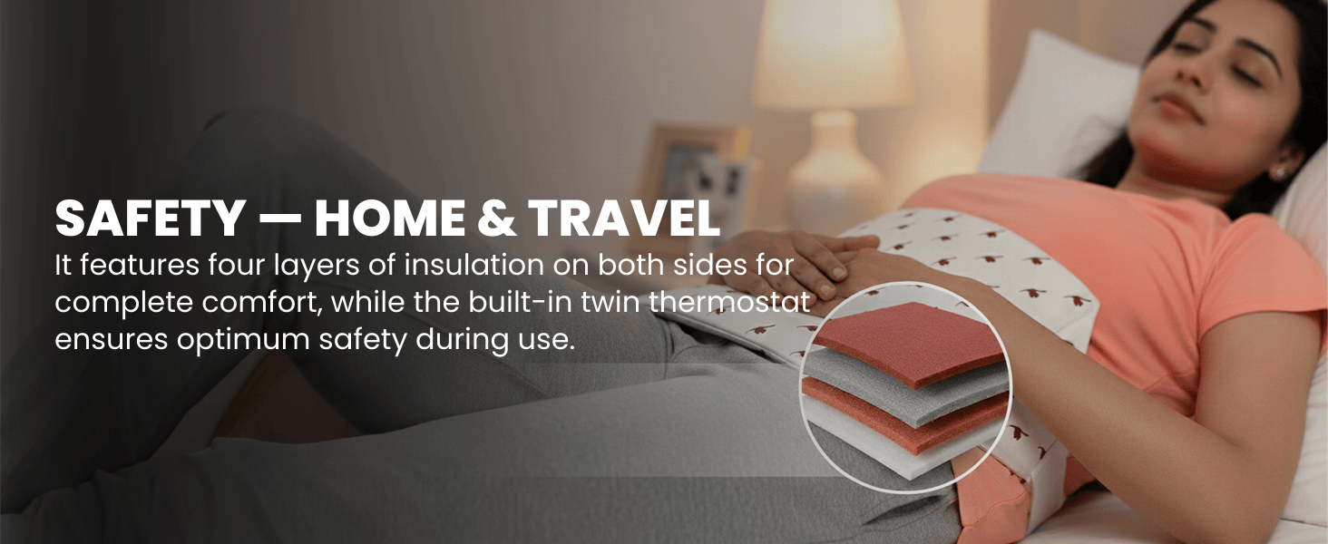 - Safety: It has 4 layers of insulation on either side for complete comfort and the electric heating belt has built-in twin thermostat that ensures optimum safety.