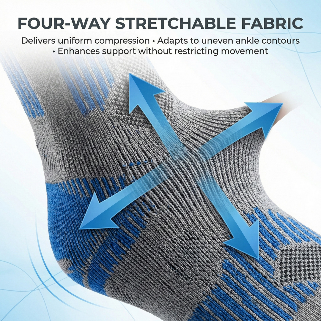 The elasticized wrap in the figure of eight prevents inversion or aversion injuries by improving the ankle stability. It also allows controlled compression and provides relief from pain. - FOUR WAY STRETCHABLE FABRIC