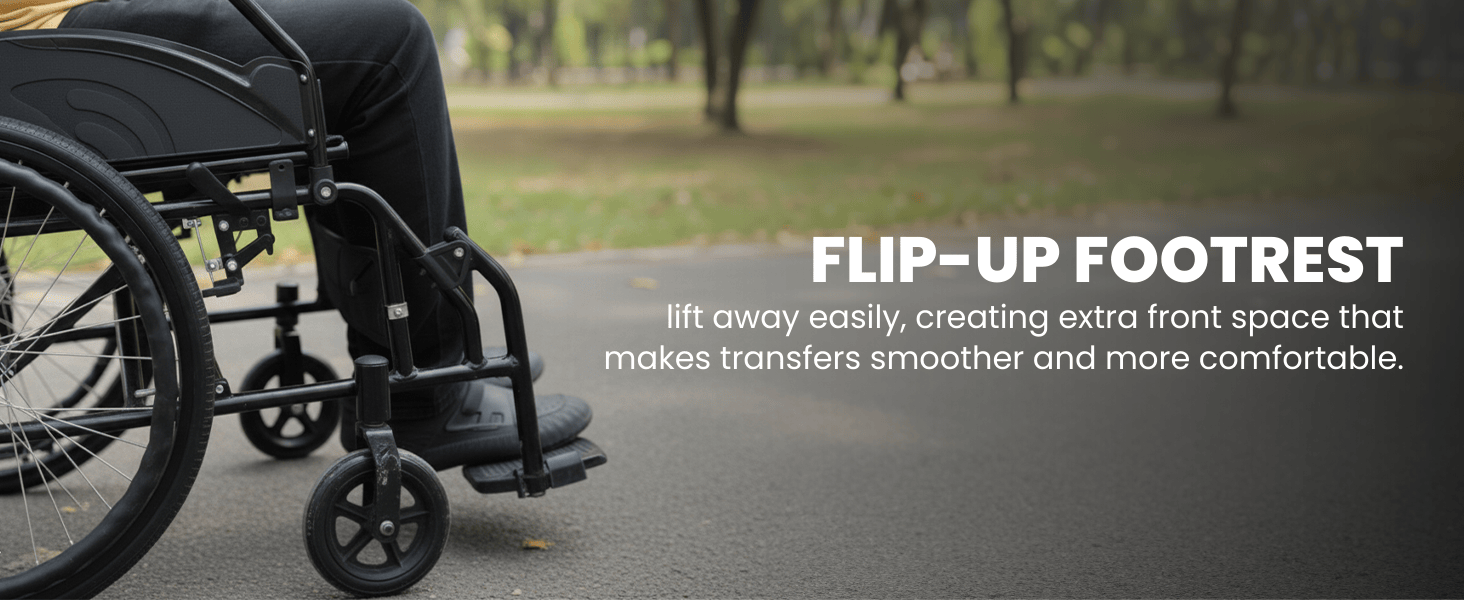 Lightweight aluminum folding wheelchair with half-backrest, auto-lock brake, and flip-up footrest & Fixed Armrest ideal for safe, portable, and comfortable patient mobility.
