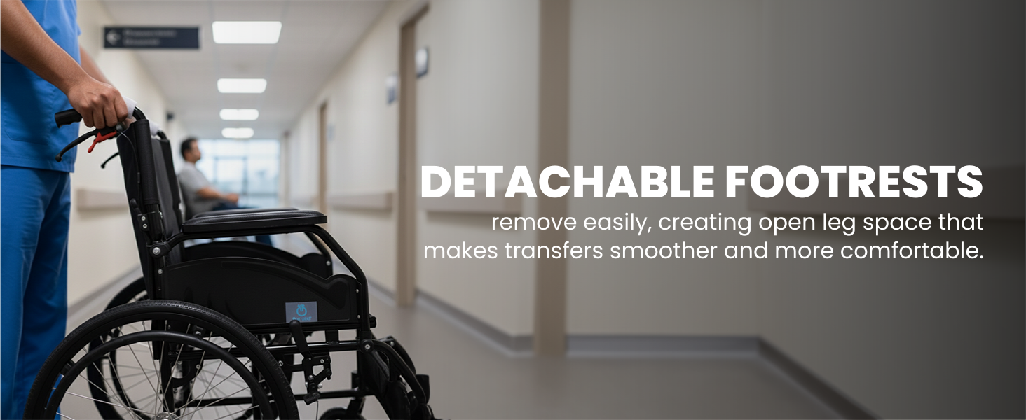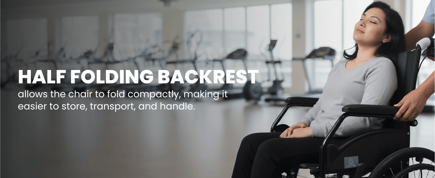 Lightweight aluminum folding wheelchair with half-backrest, auto-lock brake, and flip-up footrest & Fixed Armrest ideal for safe, portable, and comfortable patient mobility.