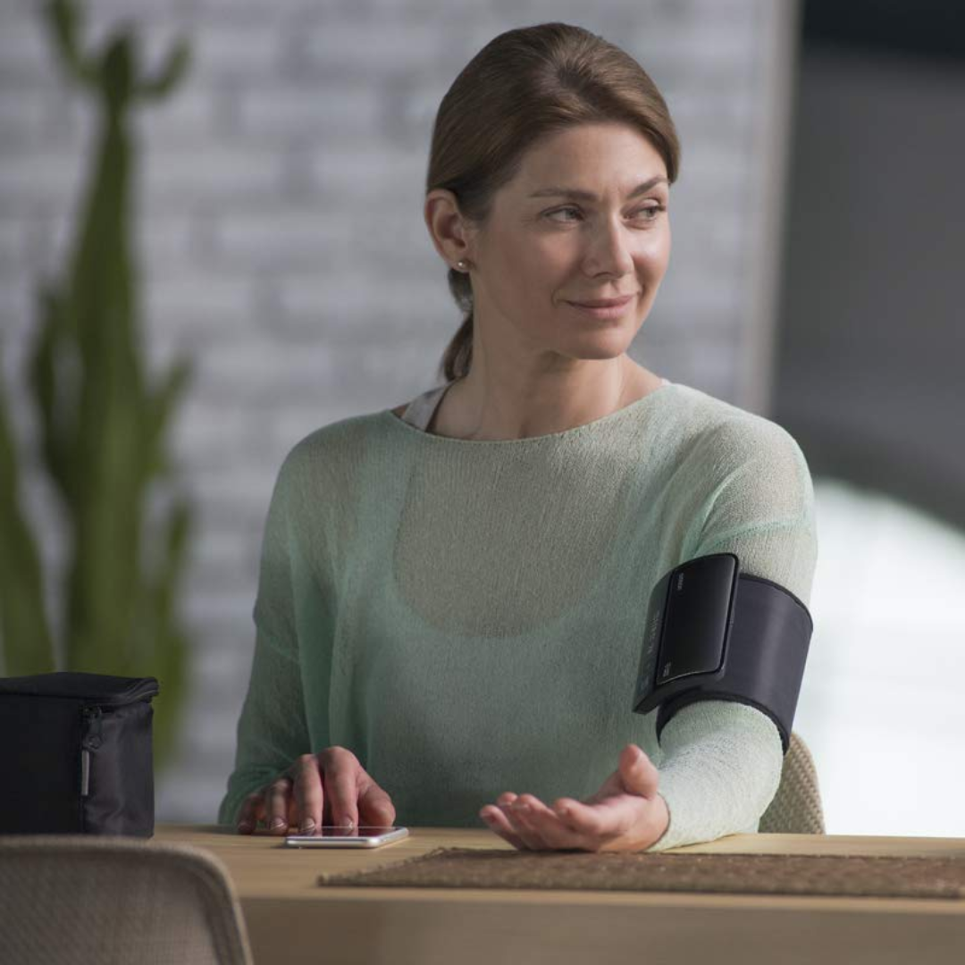 The omron smart elite+ HEM-7600T delivers 360° accuracy, smartphone connectivity, portability, and irregular heartbeat/body movement detection.