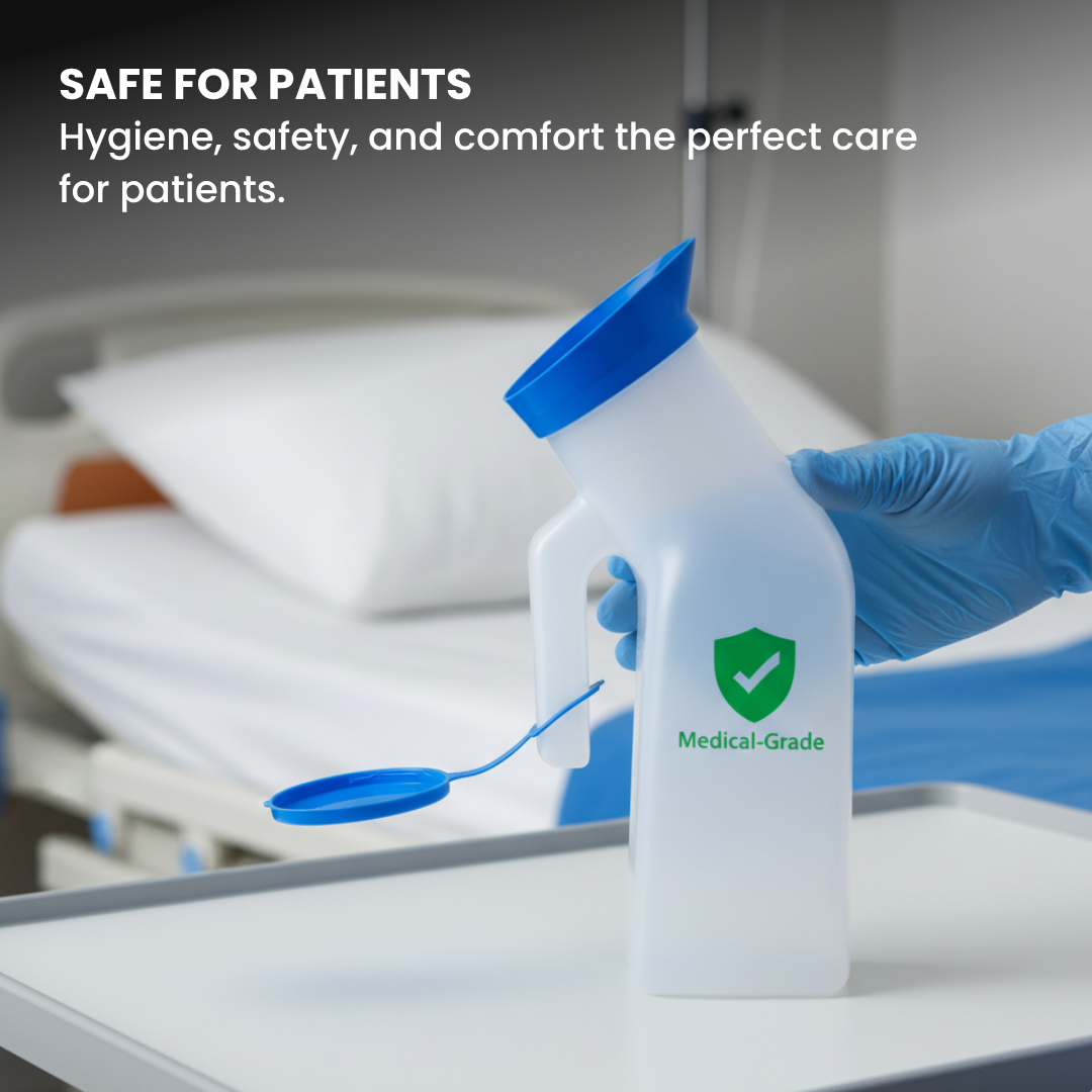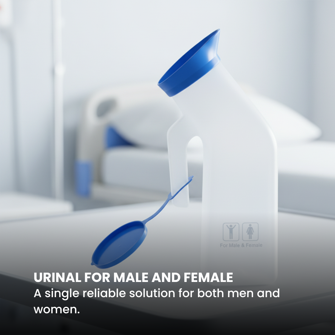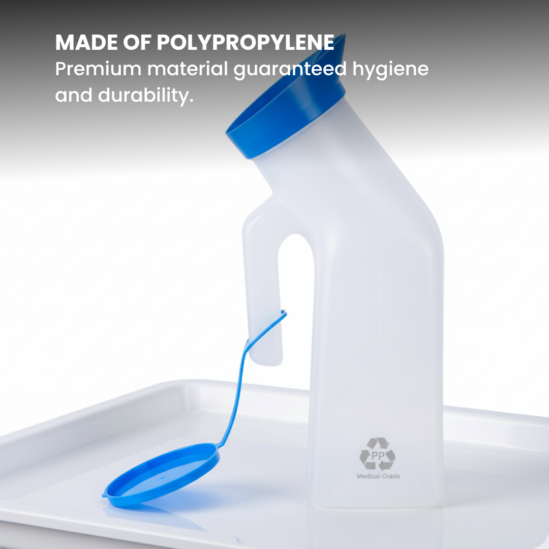 Durable polypropylene unisex urinal with 1000 ml capacity safe, lightweight, and convenient for male and female patients in hospitals, home care, or travel.