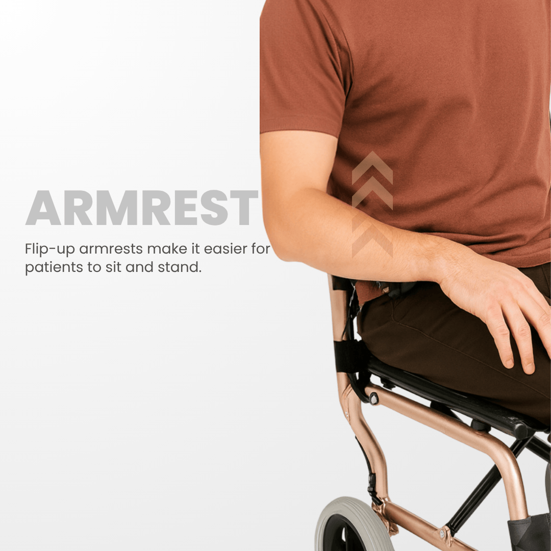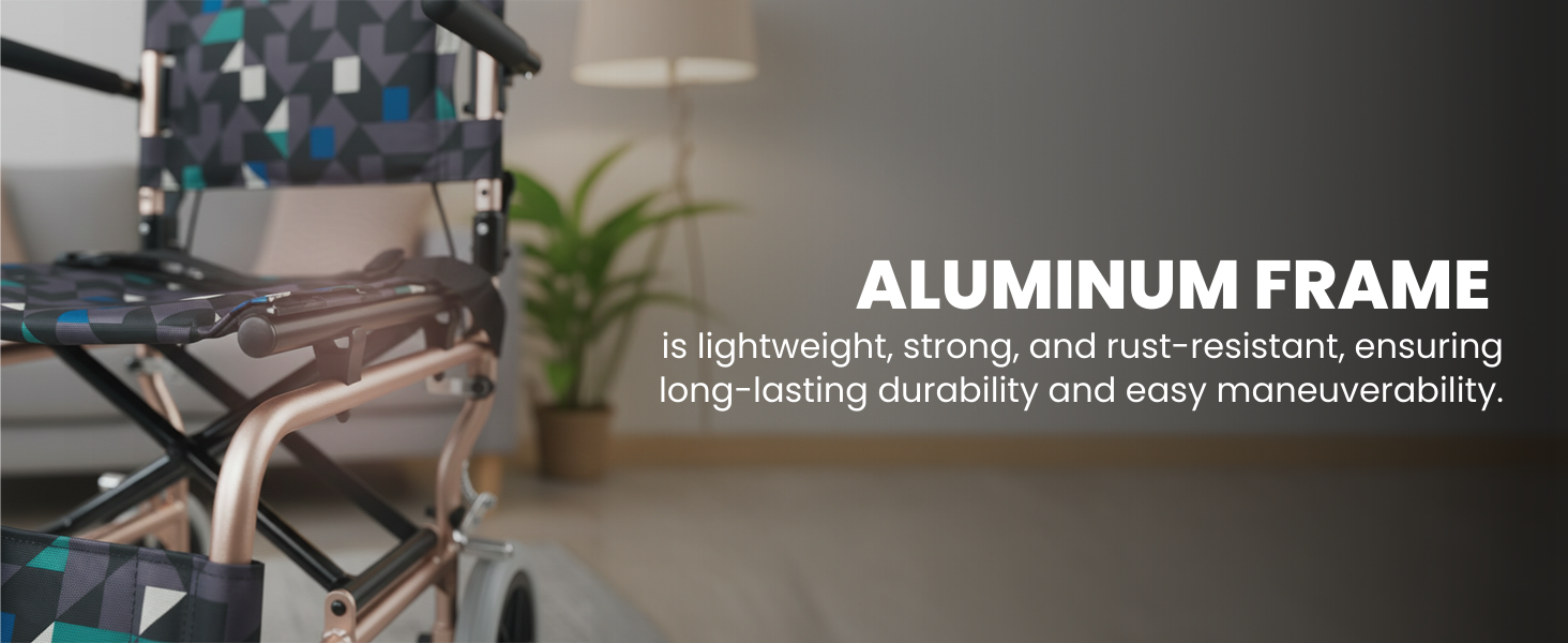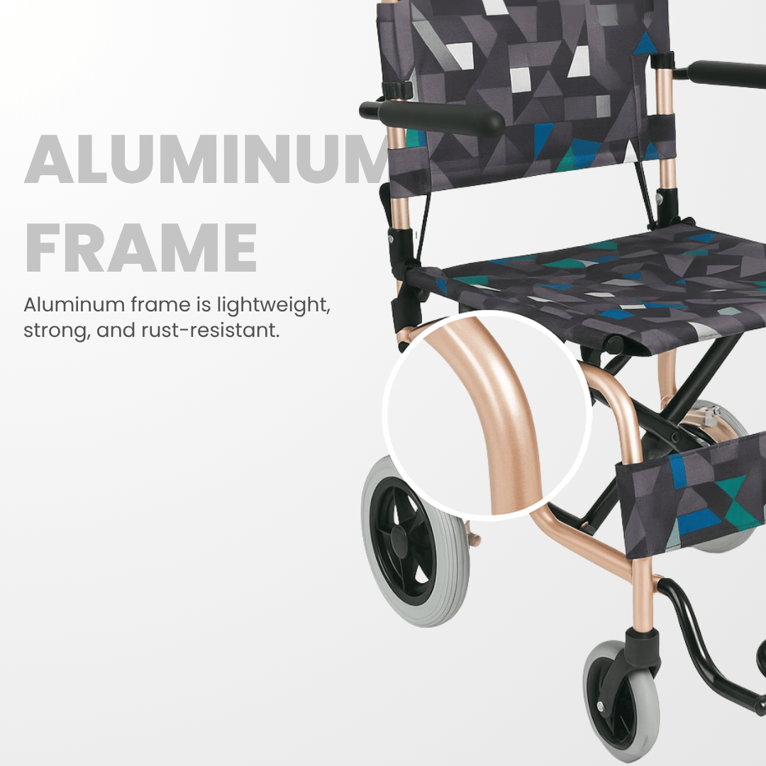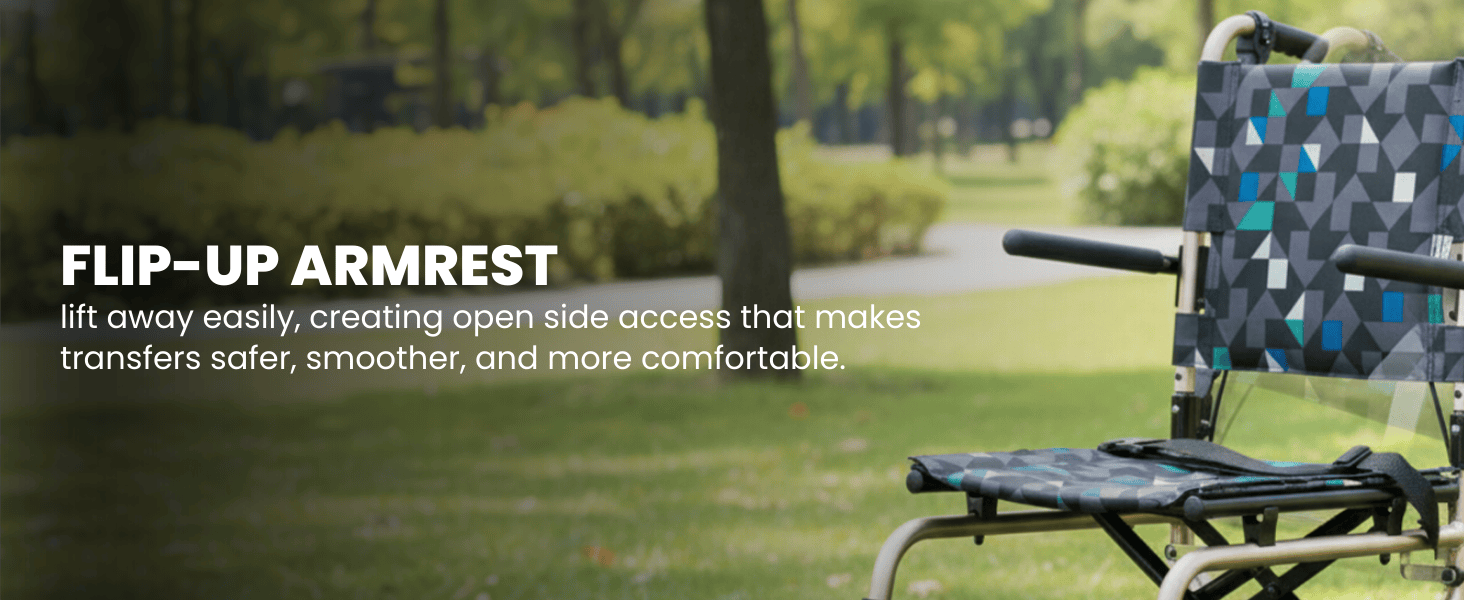 Lightweight aluminum wheelchair with lifter, folding backrest, flip-up armrest foldable legrest and storage bag designed for safe, convenient mobility and caregiver-friendly handling.